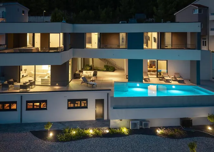 Omis Cetina Canyon ist in einer Entfernung von ungefähr 10 Autominuten von dieser Villa und der Flughafen Split ist in 58 Minuten mit dem Auto zu erreichen. Die Villa Dispet, Sea View, Pool, Jacuzzi, Sauna, Cinema liegt nur 3 km vom Strand.